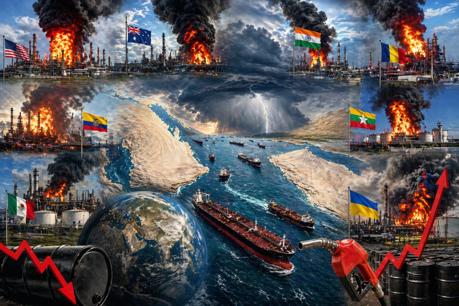 Valero Port Arthur au Texas. Viva Energy Geelong en Australie. HPCL Pachpadra en Inde. CET Vest à Bucarest. Esmeraldas en Équateur. Port Homalin au Myanmar. Pemex Olmeca au Mexique. Plus les frappes ukrainiennes documentées sur Primorsk, Ust-Luga, Tuapse, la raffinerie NORSI. Plus LyondellBasell Bayport, Petromax Channelview. Plus le dépôt thermique qui vient de sauter à Bucarest il y a quelques heures — 30 tonnes de fioul enflammées, trois transformateurs partis, la moitié de la capitale dans le noir, aucune explication officielle. Vingt-quatre heures plus tôt, à Pachpadra dans le Rajasthan, la plus grande raffinerie pétrochimique de l’ouest indien partait en fumée la veille de son inauguration par Narendra Modi. Et il faudrait admettre que tout cela n’est qu’une accumulation de coïncidences industrielles. Pendant ce temps, la guerre déclenchée par les États-Unis et Israël contre l’Iran le 28 février a fermé le détroit d’Hormuz, fait bondir les prix du pétrole, asséché l’approvisionnement mondial. L’Agence internationale de l’énergie parle du “plus grand choc d’approvisionnement pétrolier de l’histoire du marché mondial”. Et le moindre journal français trouve le sujet de la série noire des raffineries passionnant au point de n’en rien écrire.